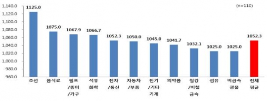 조사결과, 제조업 손익분기 환율은 1052.3원으로 나타났다. 업종별로 조선업의 손익분기 환율이 1125.0원으로 가장 높았고 ▲음식료 1075.0원 ▲펄프·종이·가구1067.9원 ▲석유화학 1066.7원 ▲전자·통신 1052.3원 ▲자동차·부품이 1050.0원으로 뒤를 이었다.