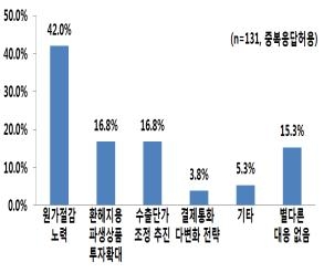 조사 기업들은 원화가치 상승에 따른 경영실적 악화 방지를 위해 원가절감노력(42.0%), 환헤지용 파생상품 투자확대(16.8%), 수출단가 조정 추진(16.8%) 등 자체 대응 노력을 하고 있지만, 별다른 대응책을 마련하지 못하고 있는 기업도 15.3%에 달했다.