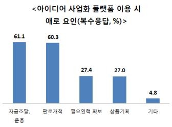 창업기업의 대표적인 애로사항인 자금조달 이외에 판로개척도 주요 애로사항 중 하나인 것으로 파악됐다. 아이디어 사업화 플랫폼 이용시 예상되는 어려움 또는 겪었던 어려움을 묻는 질문(복수응답)에 전체 응답자 252명 중 판로개척에 60.3%(152명)이 대답해 자금조달 및 운용을 선택한 61.1%(154명)과 큰 차이를 보이지 않았다. 반면 필요인력 확보와 상품기획의 어려움은 각각 27.4%(69명), 27.0%(68명)으로 판로개척에 비해 상대적으로 덜한 것으로 나타났다.