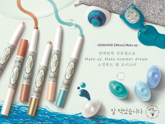 스킨푸드의 2014 여름 메이크업 라인 '펄 오이스터' 중 '해조 미네랄 워터프루프 아이섀도우 스틱'은 부드럽게 발리면서도 강력한 워터프루프와 롱래스팅 효과로 하루 종일 생생한 아이 메이크업을 유지시켜 준다. 포인트 메이크업으로 활용하면 좋은 시원한 미네랄 블루 컬러를 포함해 6가지 컬러가 출시됐다.