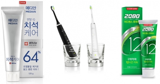 (왼쪽부터)메디안 덴탈 아이큐 타타르케어 치약 화이트, 필립스 소닉케어 다이아몬드클린, 2080 어드밴스 후레쉬 치약