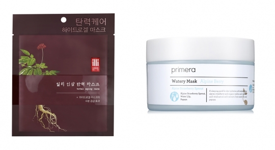 (왼쪽부터)일리 인삼 탄력 마스크, 프리메라 알파인 베리 워터리 마스크