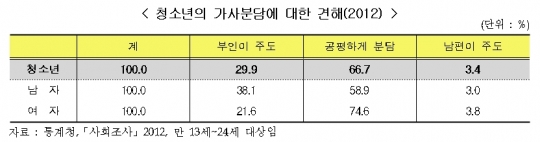 결혼에 대해 남자 청소년은 62.9%가 '해야 한다'고 응답했으나 여자 청소년은 절반에 못 미치는 45.6%에 그쳐 남녀 청소년 간 인식 차이를 보였다. 양성평등 인식과 관련해서는 2013년 청소년 10명 중 9명(91.7%)은 '남자와 여자는 모든 면에서 평등한 권리를 가져야 한다'는 의식을 갖고 있었다. '가사를 공평하게 분담해야 한다'고 응답한 비율은 여자 청소년이 74.6%로 남자 청소년(58.9%)과 큰 차이가 났다. 반면 '부인이 주도해야 한다'고 응답한 비율은 남자 청소년이 약 16% 포인트 높았다.
