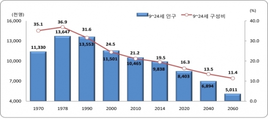 한편 올해 우리나라 총인구 중 청소년 인구 비중은 19.5%였다. 2014년 총인구는 5042만4000명으로 2010년에 비해 2.1% 증가한 반면 청소년 인구(9~24세)는 1000만명 밑으로 내려간 983만8000명으로 6.0% 감소했다. 청소년 인구는 1978년 36.9%로 정점을 기록한 이후 지속적으로 감소하는 추세이며 2060년에는 11.4%에 이를 것으로 추정된다. 학령인구(6∼21세) 비중도 2010년 20.3%에서 올해 18.1%로 떨어진 데 이어 2060년에는 11.1%까지 낮아질 것으로 예상된다.