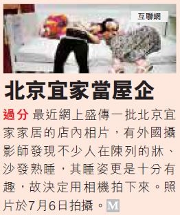이케아 베이징 지점에는 매장으로 '피서'나온 고객들이 쉽게 눈에 띈다. 소파 양쪽에 편히 기대 달콤한 잠을 청하는 여성도 있고, 아예 신발을 벗고 침대에 올라가 이불까지 끌어안고 자는 남성도 있다.