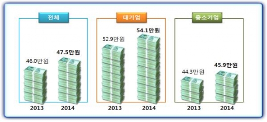 하계휴가비를 지급하는 기업의 평균 휴가비는 47만5000원으로, 지난해 46만원에 비해 1만5000원(3.3%) 증가했다. 휴가비는 2011년 이후 2년 연속 전년대비 감소하다 올해 들어 증가로 전환됐다. 규모별로 중소기업의 경우 45만9000원으로 전년대비 1만6000원(3.6%) 증가한 반면, 대기업은 54만1000원으로 전년대비 1만2000원(2.3%) 증가했다.