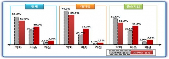 올해 경기상황에 대해서는 57.0%의 기업이 전년보다 '악화됐다'고 응답했으며, 40.0%는 전년과 비슷하다고 답했다. 반면 '개선됐다'는 2.8%, '매우 개선됐다'는 0.2%에 불과했다. 이는 원화 강세로 인한 수출환경 악화, 내수부진 장기화 등으로 기업의 체감경기가 회복되지 못하고 있기 때문인 것으로 풀이된다.