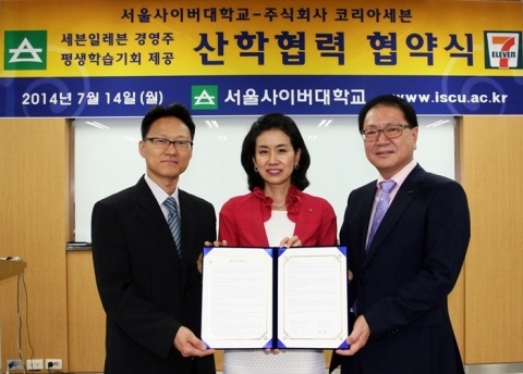 왼쪽부터 이준인 세븐일레븐 경영주 협의회 회장, 강인 서울사이버대학교 총장, 정승인 세븐일레븐 대표이사/세븐일레븐 제공