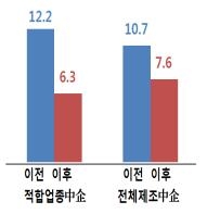 전체 제조 중소기업의 매출액증가율은 적합업종 지정 이전 2년간 연평균 14.4%에서 지정 이후인 2012년 4.5%로 9.9%p 둔화됐다. 총자산증가율도 적합업종 영위기업은 12.2%에서 6.3%로 5.9%p 둔화된 반면, 전체 제조 중소기업은 3.1%p 둔화됐다.