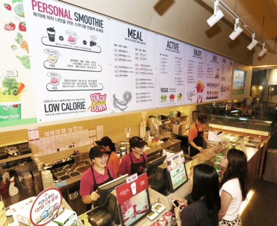 이번 리뉴얼 중 가장 큰 변화는 미국처럼 총 47종의 스무디를 M·A·E·V·K의 5가지 카테고리로 분류한 것이다. 제품 라인의 각 첫 글자를 활용한 것으로 ▲M(meal)은 식사용 ▲A(active)는 수분 밸런스 및 면역력 강화 ▲E(enjoy)는 활력 증진 ▲V(veggie)는 야채와 과일의 비타민·식이섬유 섭취 ▲K(kids)는 성장기 어린이의 건강을 위한 스무디라는 의미다. 고객들은 M1, A3 등 메뉴보드에 적힌 이니셜과 번호만 보고도 스무디를 쉽게 주문 가능하며 해당 스무디의 섭취 목적까지 바로 알 수 있다.