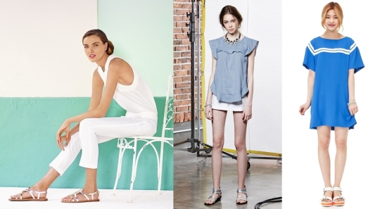 흰색 슬렉스 바지에 슬리브리스를 매치한 올 화이트 룩은 보는 이에게 시원함을 전달할 수 있고 메탈 소재의 샌들로 포인트를 준다면 깔끔하면서도 세련미를 뽐낼 수 있다.