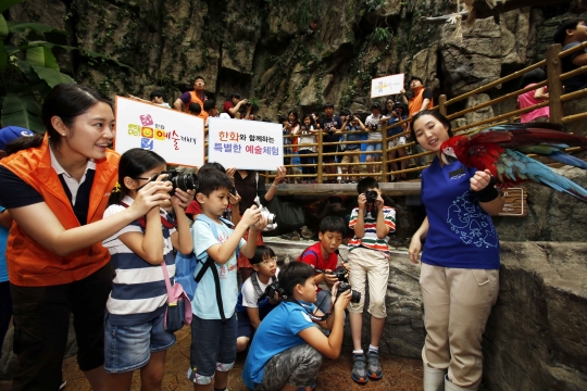 한화는 전국 59개 사업장에서 자매결연을 맺은 지역 복지시설 아동들과 특별한 문화·예술체험활동을 펼친다. 23일 오전 한화 임직원과 초등학생이 경기도 '일산 아쿠아플라넷'을 방문했다./한화 제공