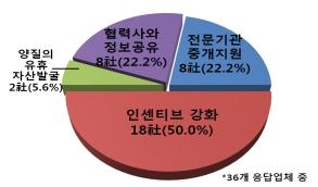 또 대기업의 유휴자산이 협력사 등에 활용되기 위한 촉진과제에 대해 '특허유지비 전액면제, 이전설치비 지원 등 유휴자산 공급기업과 수요기업에 대한 인센티브 강화(18사)''전문기관의 유휴자산 중개지원(8사)''사내 동반성장 전담조직과 유휴자산 관리조직간 업무공조체계 구축으로 협력사와 유휴자산 정보공유 촉진(8사)'순으로 선호했다.