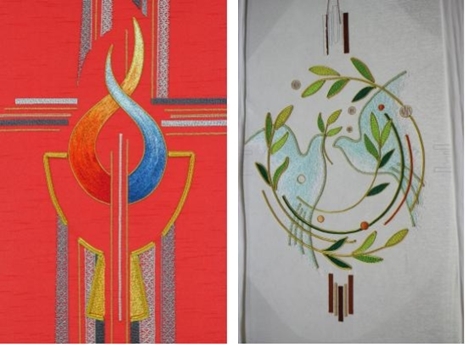 18일 평화의 화해를 위한 미사의 제의는 백색이다. 평화를 상징하는 비둘기와 구원을 뜻하는 올리브 가지가 원형을 이루고 있다. 손으로 수놓은 비둘기는 수채화를 연상시킬 정도로 섬세하게 표현됐다.