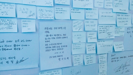 경기도 용인 삼성트레이닝센터 내 설치된 '응원의 벽'이 제17회 인천아시안게임 국가대표팀의 선전을 기원하는 자필 응원 메시지로 가득하다. '응원의 벽'은 삼성스포츠단 소속 선수들이 국가대표팀에게 보내는 자필 응원 메시지로 꾸민 염원이 담긴 벽이다./삼성 제공