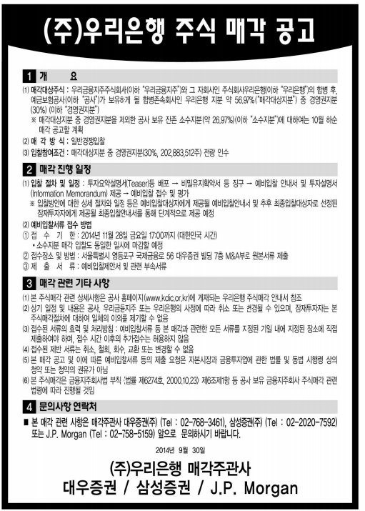 우리은행 매각주관사가 우리은행 경영권 지분 30%(2억288만3512주)를 일반 경쟁 입찰방식으로 매각한다는 30일 공고를 냈다.