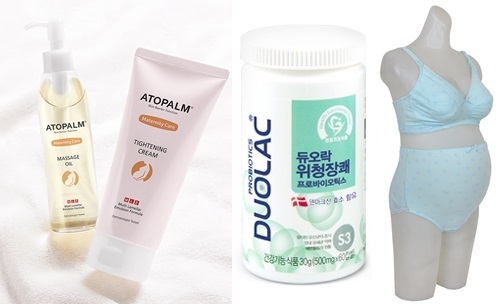 왼쪽부터 아토팜 '매터니티 케어 라인', 쎌바이오텍 '듀오락 위청장쾌', 마터니티 임부용 속옷.