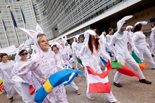 토끼 복장을 한 시민들이 동물실험 금지의 중요성을 알리며 퍼포먼스를 펼치고 있다. /러쉬 제공