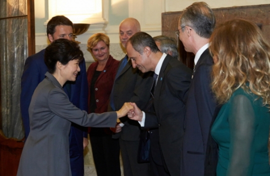 박근혜 대통령이 17일 오후(현지시간) 이탈리아 로마 팜필리 공원에서 양국 정상 만찬 및 정상회담에 앞서 참석자들과 인사를 나누고 있다./청와대 제공