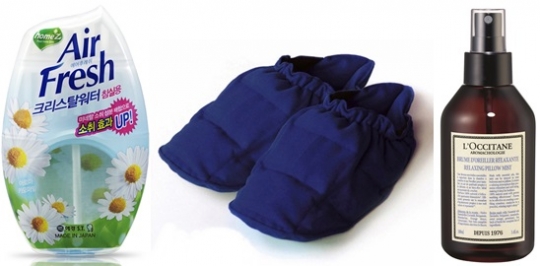 왼쪽부터 애경에스티 '홈즈 에어후레쉬 크리스탈워터 침실용 아로마 카모마일', 시셀 '리늄릴렉스', 록시땅 '릴랙싱 필로우 미스트'.