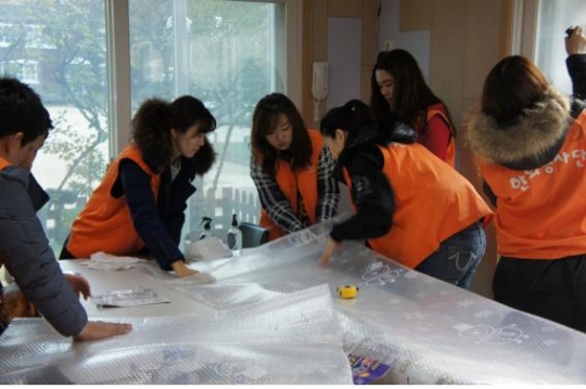 한화/무역 직원들이 단열 에어캡 설치 활동을 끝낸 후 아동들을 돌보고 있다./한화 제공