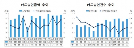 25일 여신금융협회가 발표한 '카드승인실적 분석'에 따르면 올 10월 카드승인금액은 49조2400억원으로 지난해 같은 기간보다 3조4200억원(7.5%) 증가했다.