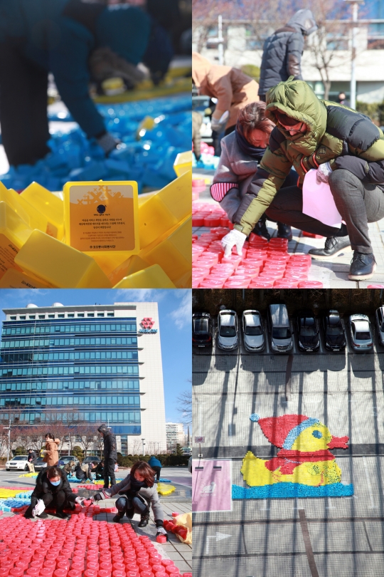 산타덕 모자이크를 완성한 코오롱사회봉사단./코오롱 제공
