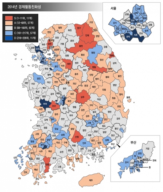 영월 외에도 충북 단양, 강원 태백 등 17개 지자체가 S등급을 받았고, 경기 여주, 인천 부평, 충남 논산 등 54개는 A등급, 부산 서구, 대전 대덕, 전북 무주 등 118개는 B등급, 경남 김해, 경기 화성, 오산 등 28개는 C등급, 경북 청도, 강원 평창, 경기 남양주(최하위) 등 11개는 D등급을 받았다.
