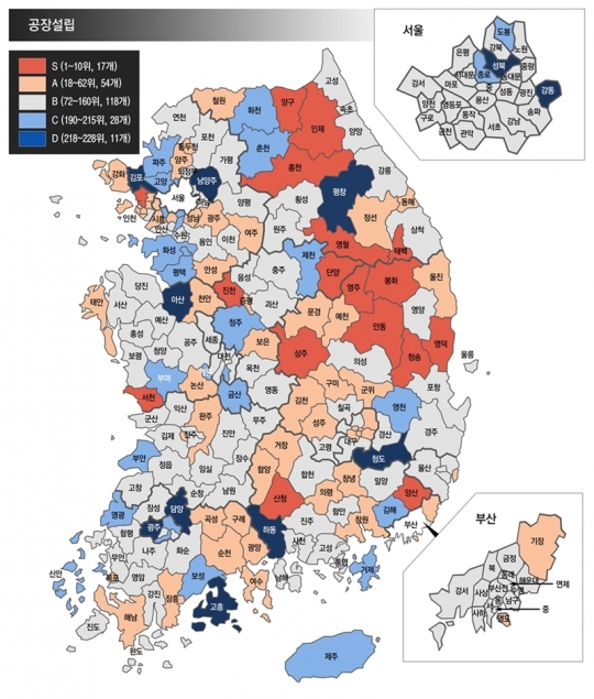 기업체감도는 경기 양평과 강원 양양이 100점 만점에 78점으로 1등을 차지했으며, 경제활동친화성은 충남 논산이 85.8점으로 최고점을 받았다. 부문별로 공장짓기 가장 좋은 지역은 강원 영월(94.2점), 다가구주택 신축환경이 가장 좋은 지역은 경기 여주, 경북 김천, 전남 장흥 등 16개 지자체(100점)로 집계됐다.