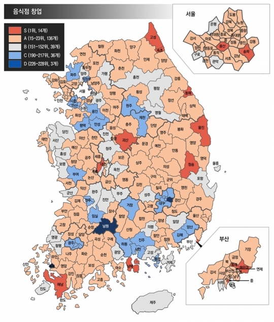 일반음식점 창업이 가장 편리한 지역은 경남 남해, 서울 송파, 부산 해운대 등 14개 지자체(100점), 중소기업 창업지원은 경남 창원, 강원 동해, 제주도 등 3개 지자체가 기업유치전략은 충북 보은이 가장 뛰어난 것으로 조사됐다.