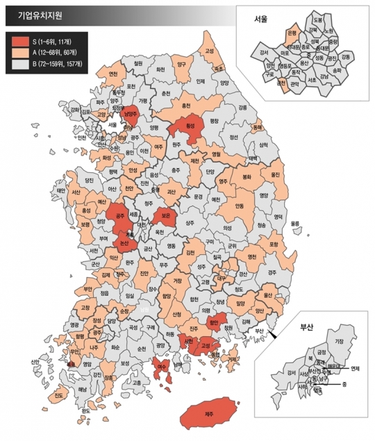 이들 지자체 외에도 전북 정읍, 경남 함양 14개 지자체가 S등급을 받았다. 충남 논산, 강원 춘천, 경북 김천 등 58개는 A등급, 충북 보은, 전북 남원, 경기 안양 등 88개는 B등급, 전남 진도, 경기 하남, 경북 고령 등 57개는 C등급, 경북 영양군, 전북 임실군, 강원 고성군(최하위) 등 11개는 D등급을 받았다. 기업체감도는 규제합리성, 행정시스템, 행정행태, 공무원 태도, 규제개선의지를 토대로 기업이 느끼는 지방행정 만족도이다.