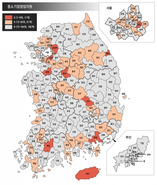 제주도, 강원 동해, 경남 창원 등 11개 지자체는 S등급을 받았고, 서울 마포, 강원 양구, 충남 논산 등 61개는 A등급, 충남 부여, 전북 임실, 전남 진도 등 156개는 B등급을 받았다. 창업지원은 규제가 아닌 기업을 위해 더 뛰려하는 적극행정으로 C, D 등급이 없다.