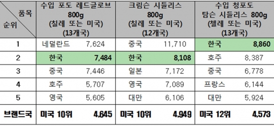 수입 포도 3종의 경우 800g 한송이를 기준으로 가격 비교 결과 레드글로브(7484원)와 크림슨 시들리스(8108원)은 13개국 중 판매가가 두번 째로 비쌌고 탐슨 시들리스 청포도는 8860원으로 한국이 가장 비쌌다.