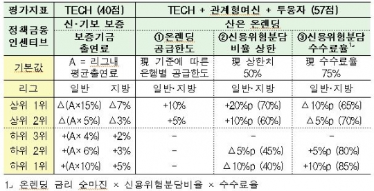 기술금융 우수 은행에 대해선 신용보증기금기술보증기금 출연료 측면에서 인센티브를 부여하며, 관계형 여신이나 투융자 부분 우수은행에는 온렌딩 측면에서 인센티브를 제공한다.