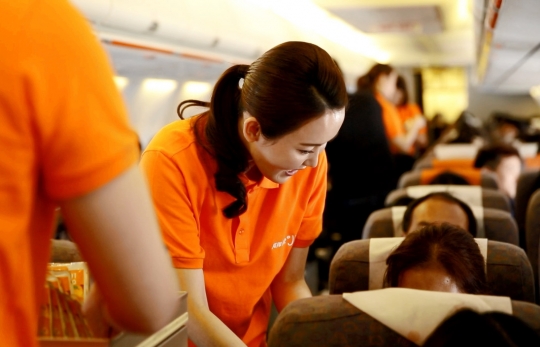 제주항공 1기 승무원이 6일 기내에서 승객에게 창립 10주년 증정품을 전달하고 있다.