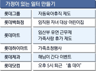 롯데그룹은 가족친화경영의 일환으로 일과 가정이 균형을 이루는 기업문화 조성에 전 계열사가 동참하고 있다.