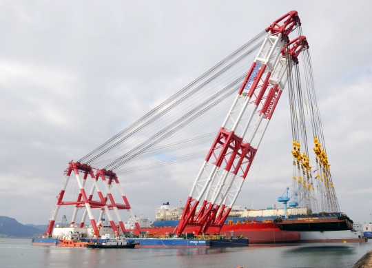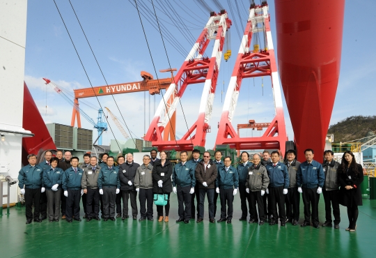 박종봉 현대중공업 해양사업 대표(앞줄 왼쪽 9번째)와 하경진 현대삼호중공업 사장(앞줄 왼쪽 11번째) 등 관계자들이 27일 전남 영암군 현대삼호중공업에서 열린 1만톤급 해상크레인 'HYUNDAI-10000'호 준공식 후 선상에 모였다.