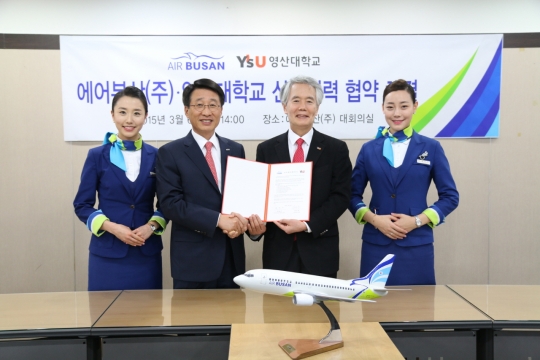 한태근 에어부산 대표(왼쪽)와 부구욱 영산대학교 총장이 6일 부산진구 범천동 에어부산 본사에서 산학협력을 위한 업무협약서에 서명하고 있다.