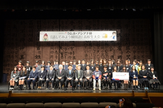 일본 도쿄 한국문화원 한마당홀에서 7일 열린 8회 금호아시아나배 한국어말하기 대회에서 수상자들이 기념촬영을 하고 있다.