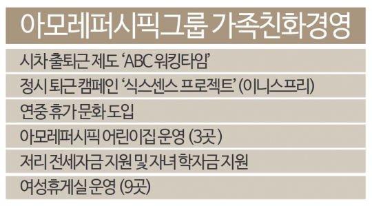 서울 중구 수표동에 위치한 아모레퍼시픽 본사에서는 매일 아침 자녀의 손을 잡고 출근하는 직원을 쉽게 찾아볼 수 있다. 자사에서 어린이집을 운영하고 있기 때문이다. 시설을 이용한 직원들은 회사에 아이를 맡길 곳이 있어 편하고 자녀와 가까이 있어 일에 보다 집중할 수 있다는 점을 장점으로 꼽고 있다.