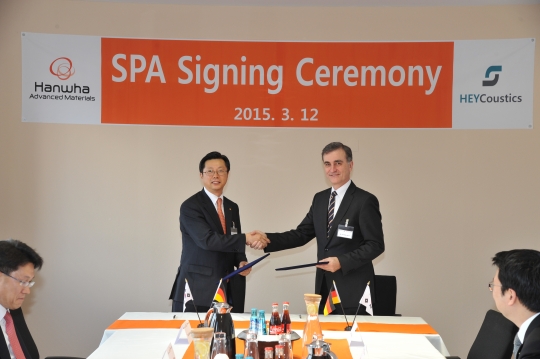12일(현지시간) 독일 바이에른주 디트푸르트시에 위치한 하이코스틱스 본사에서 한화첨단소재 이선석 대표(테이블 왼쪽)와 뮐러 브롤(mueller broll) 하이코스틱사 대표(테이블 오른쪽)가 기업 인수를 위한 협약서에 서명 후 기념촬영을 하고 있다.