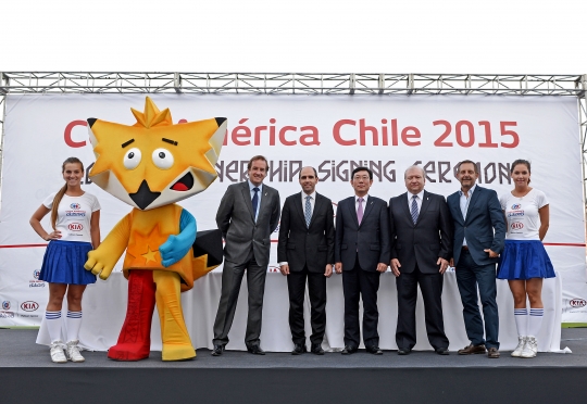 (좌측부터) 로드리고 델 라 토레 마티니(Rodrigo de la Torre Martini) 기아 칠레 대리점 이사, 세르히오 하두에(Sergio Jadue) 남미축구연맹 부회장, 김경한 기아차 중남미지역본부장, 르네 로사스(Rene Rosas) 대회조직위 수석임원, 머리시오 부드닉(Mauricio Budnik) 기아 칠레 대리점 사장이 조인식 후 기념촬영하고 있다.