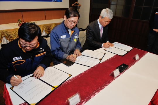 왼쪽부터 성동조선해양 협력사협의회장 신호섭 대표, 성동조선해양 대표이사 직무대행 구본익 부사장, 마산공업고등학교 이시영 교장이 산학협약을 맺고 있다.