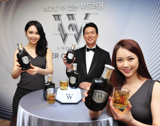18일 서울 소공동 웨스틴 조선호텔에서 열린 '윈저 W ICE' 런칭 행사에서 디아지오코리아 조길수 대표(가운데)와 모델들이 35도 신제품 '윈저 W ICE'를 선보이고 있다./디아지오코리아 제공