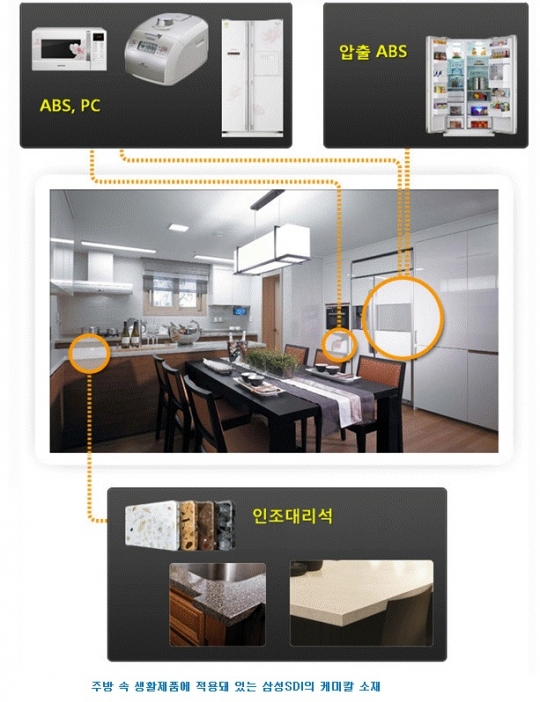 삼성SDI가 자동차와 가정주부의 안방인 주방에도 첨단 케미칼소재 적용을 확장하고 있다.