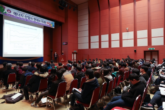 이우현 OCI 사장이 24일 전북대학교에서 '에너지 산업의 현재와 미래'를 주제로 강연하고 있다.