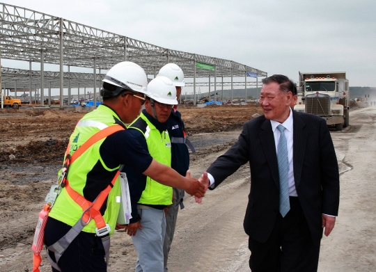 정몽구 현대차그룹 회장이 26일 기아차 멕시코공장을 방문해 공장 건설현장의 근로자들을 격려하고 있다.