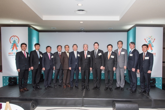 26일 예술의전당 푸치니홀에서 열린 '문화예술후원 매개단체 및 우수기관 인증식'에서 조현상 효성 부사장(오른쪽에서 5번째)과 김종덕 문화체육관광부 장관(오른쪽에서 6번째) 등이 기념촬영을 하고 있다.