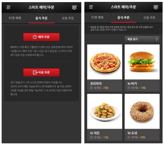 예약주문시 경기 당일 수령시간 예약도 가능하다. 바로주문시 예약 시간에 직접 수령하고 프리미엄 좌석(스카이박스·중앙테이블·1,3루 테이블석)의 경우 배달 주문이 가능하다.