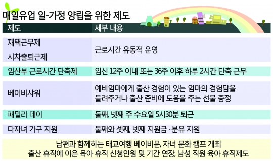 매월 둘째, 넷째 주 수요일이 되면 매일유업은 유독 빨리 불이 꺼진다. 모든 임직원들이 오후 5시30분이면 퇴근해야 하는 패밀리데이다. 일찍 귀가해 가족과 함께 시간을 보내기 위한 제도다. 퇴근시간이 잘 지켜지는지 확인하기 위해 최고경영자가 사무실을 직접 방문하기도 한다고 회사 측은 설명했다.